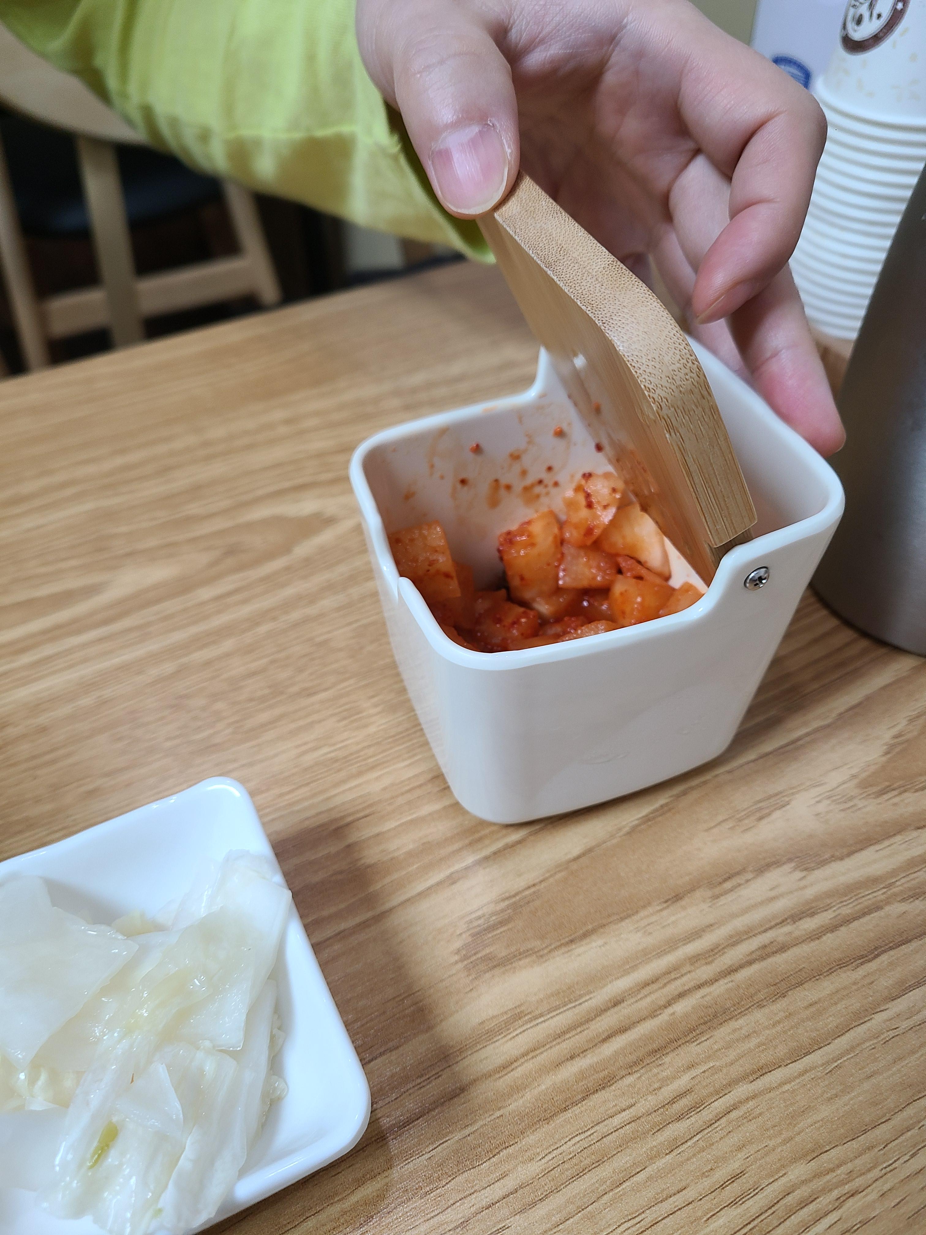 테이블에 백김치와 깍두기가 셋팅되어 있고요