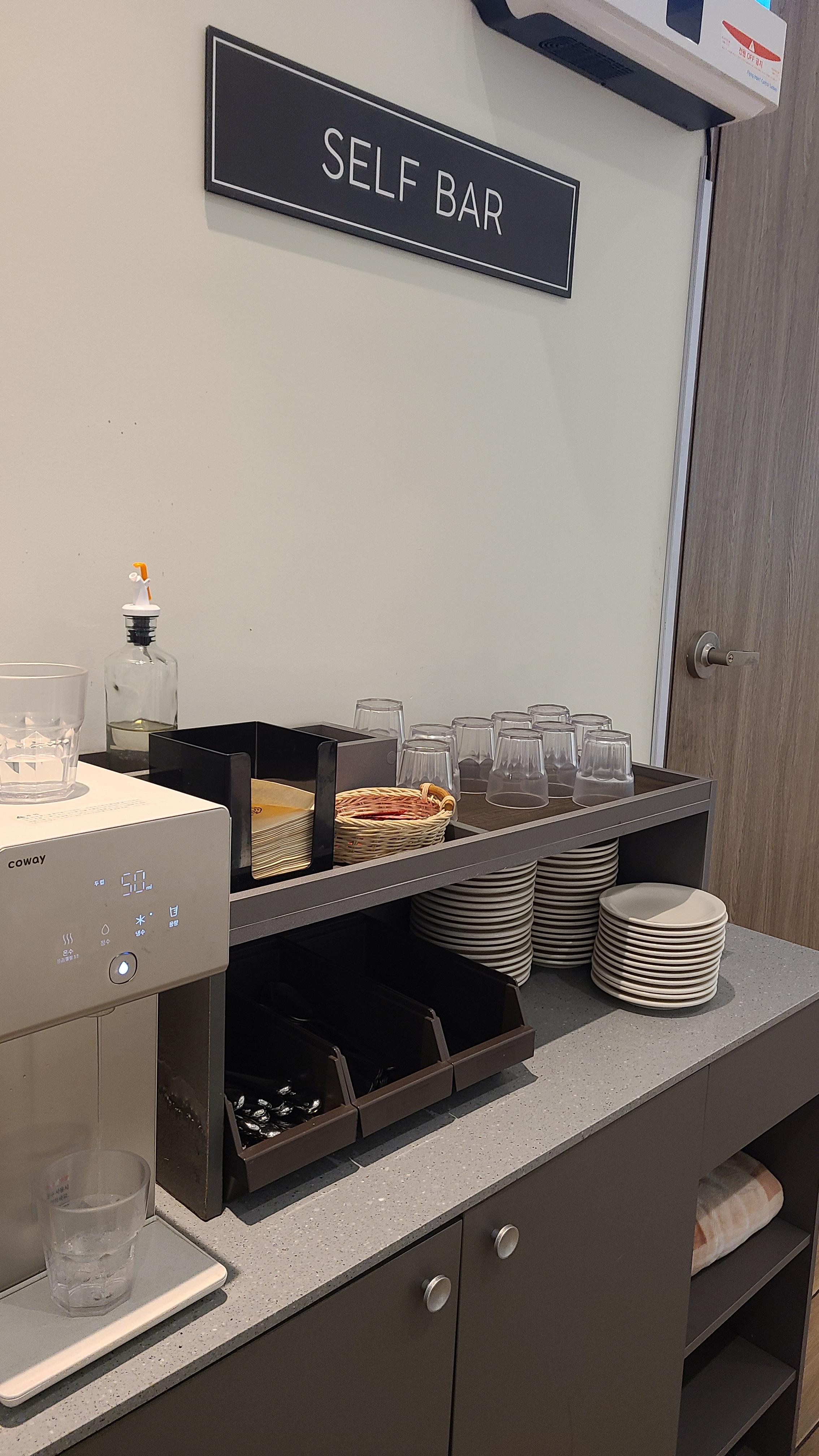 셀프바에서 접시 와 컵