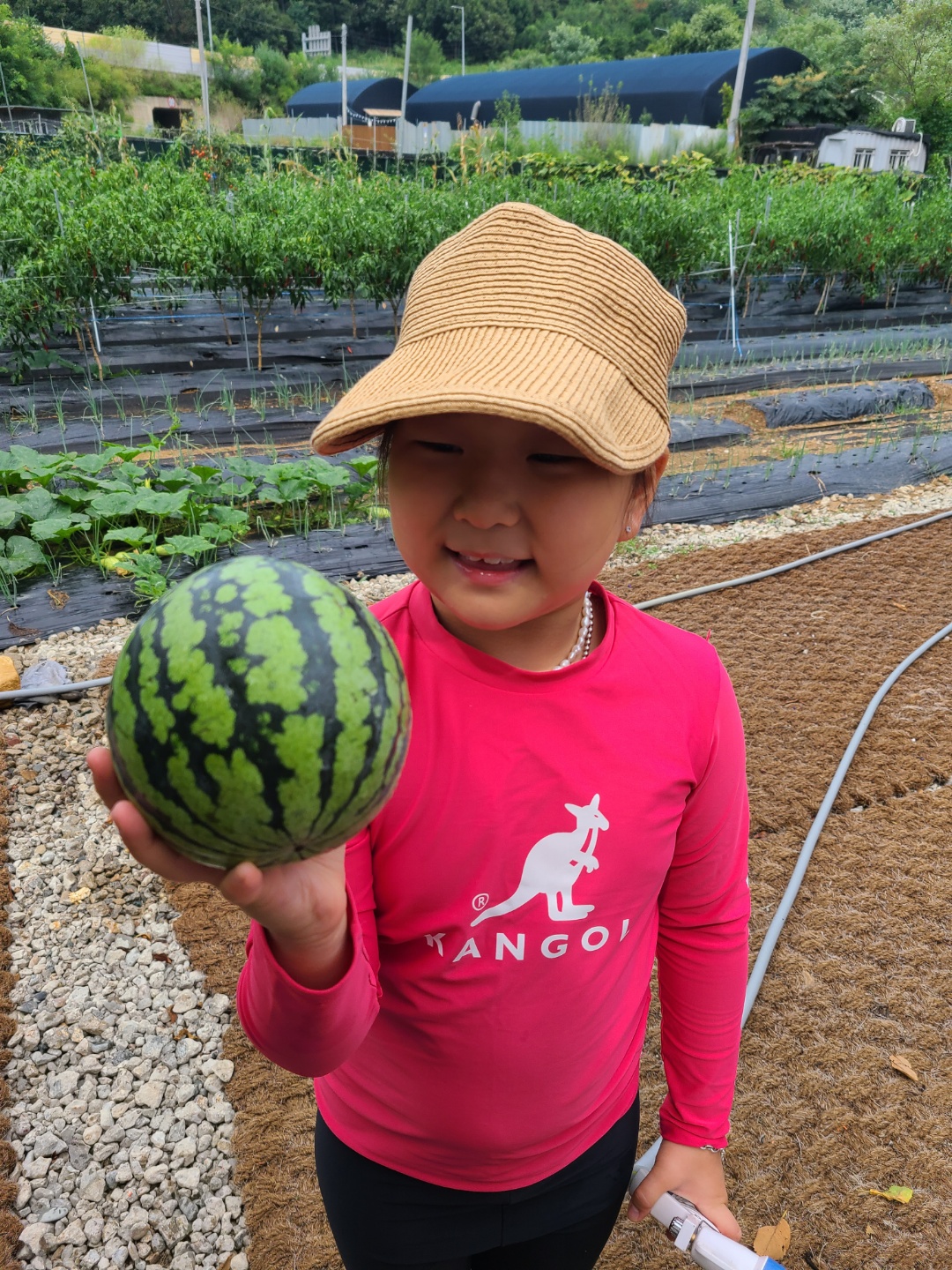 큰 욕심 없이 키운 노지 수박이랍니다. 처음 수박을 키울 때 노지에서 과일이 잘 클까 싶었고 수박농사는 처음이라 걱정이 많았어요. 역시 대박 대박 올해 수박은 농장에서 모두 재배해 먹었답니다.