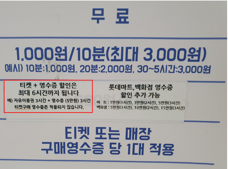 신나게 아침부터 저녁때까지 놀다 온 롯데월드 이제 주차 정산하러 키오스크 이용하러 갑니다. 사용한 영수증 몽땅 찍고 하려면 불편합니다. 주차장 나갈 때 주차정산소에서 정산해도 상관없습니다. 나갈때 키오스크에 사람 엄청 많이 줄 서있거든요... 롯데월드 종합이용권 구매하면 최대 3000원만 별도로 정산하면 됩니다. 만약 롯데월드 안에서 5만 원 사용했다면, 롯데월드 주차비는 무료 6시간까지요. 주차요금 많이 나올까 걱정하지 마시고 편하게 롯데월드에 차 가지고 가세요... 그리고 보통 롯데월드 가면 6시간 이상 있은 편하게 주차비는 3000원이다 생각하시면 됩니다.