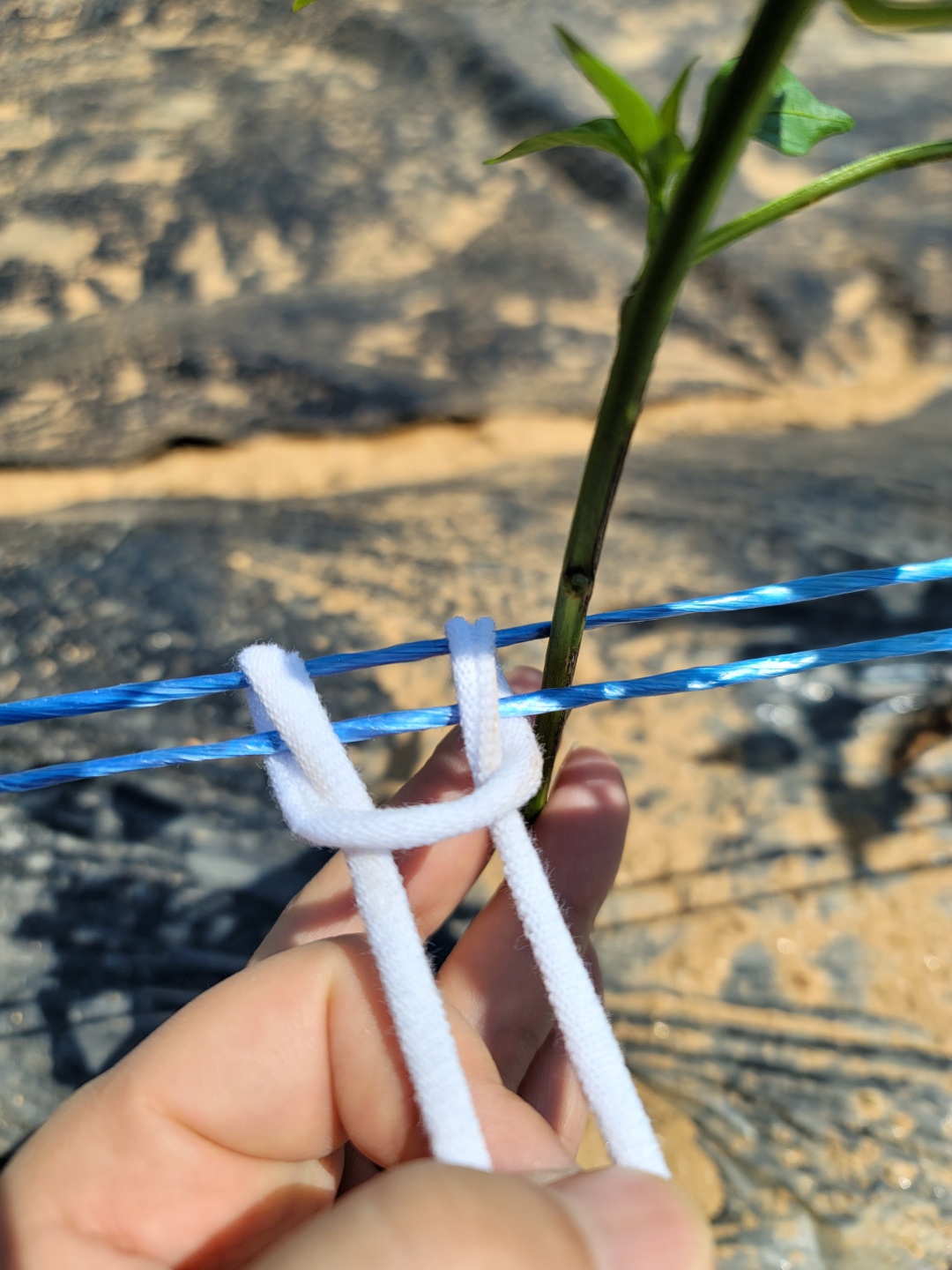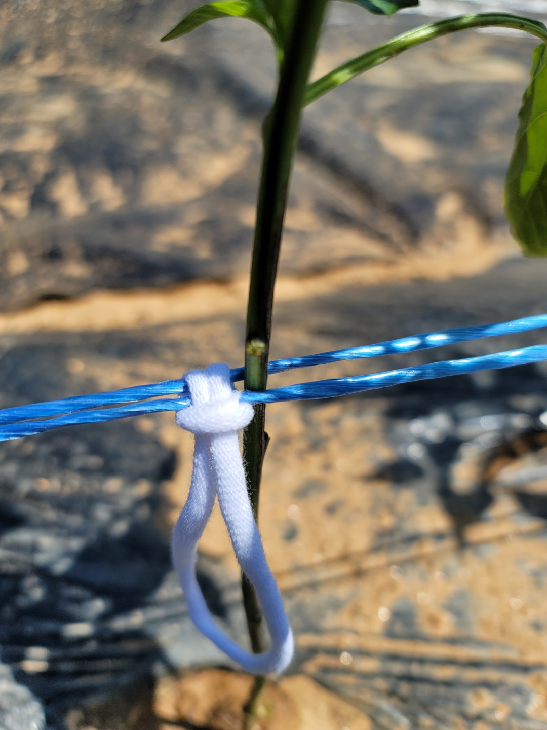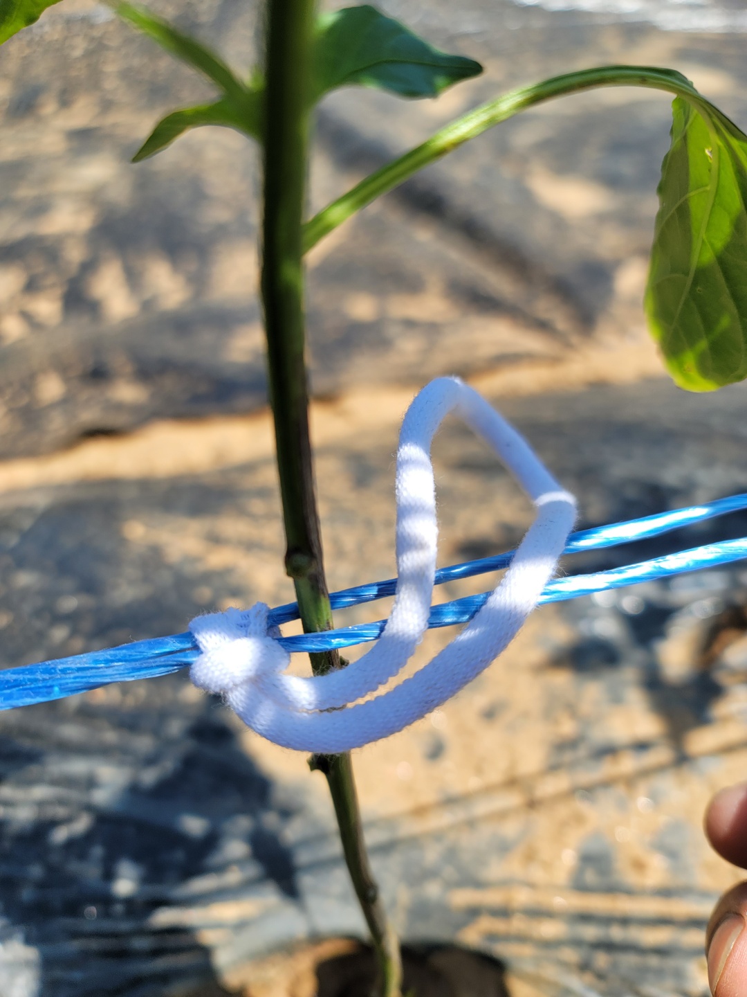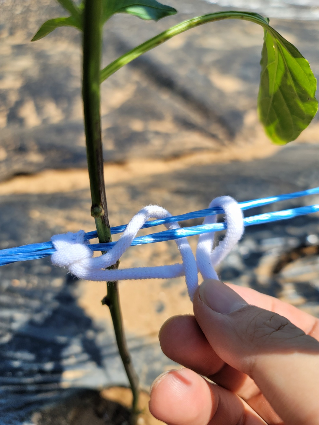양말끈으로 파란 유인줄과 고추 줄기 하나 하나를 고정시켜 줍니다.