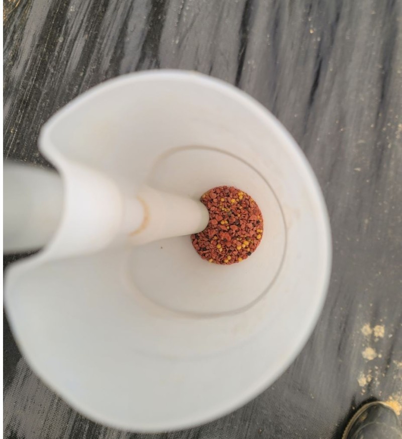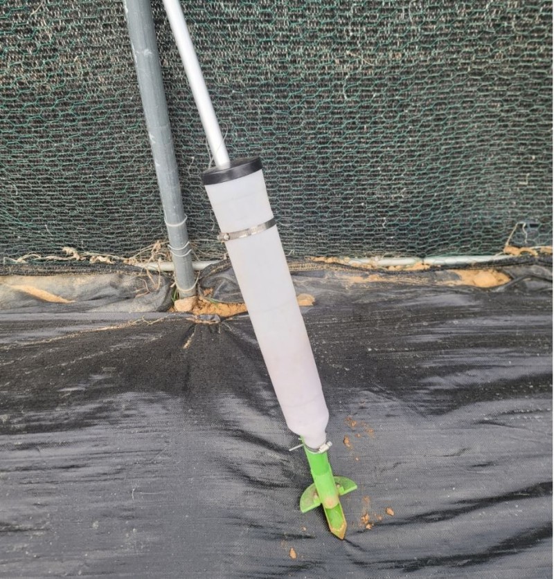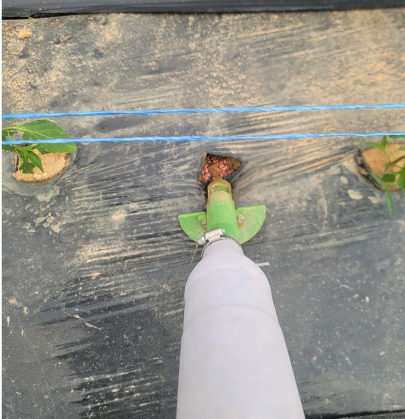 작물 사이에 미리 뚫어 놓은 구멍에 비료 주입기를 꾹 눌러 주면 일정량의 비료가 흘러 나옵니다.