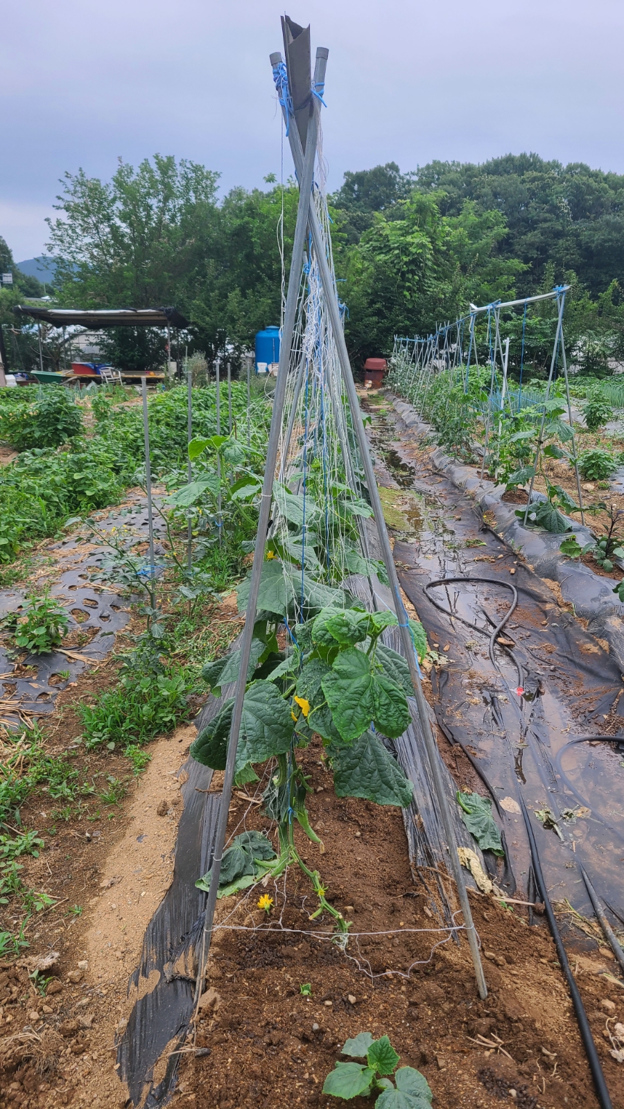 오이 지지대를 세우고 그다음 유인줄을 매야 해요~~