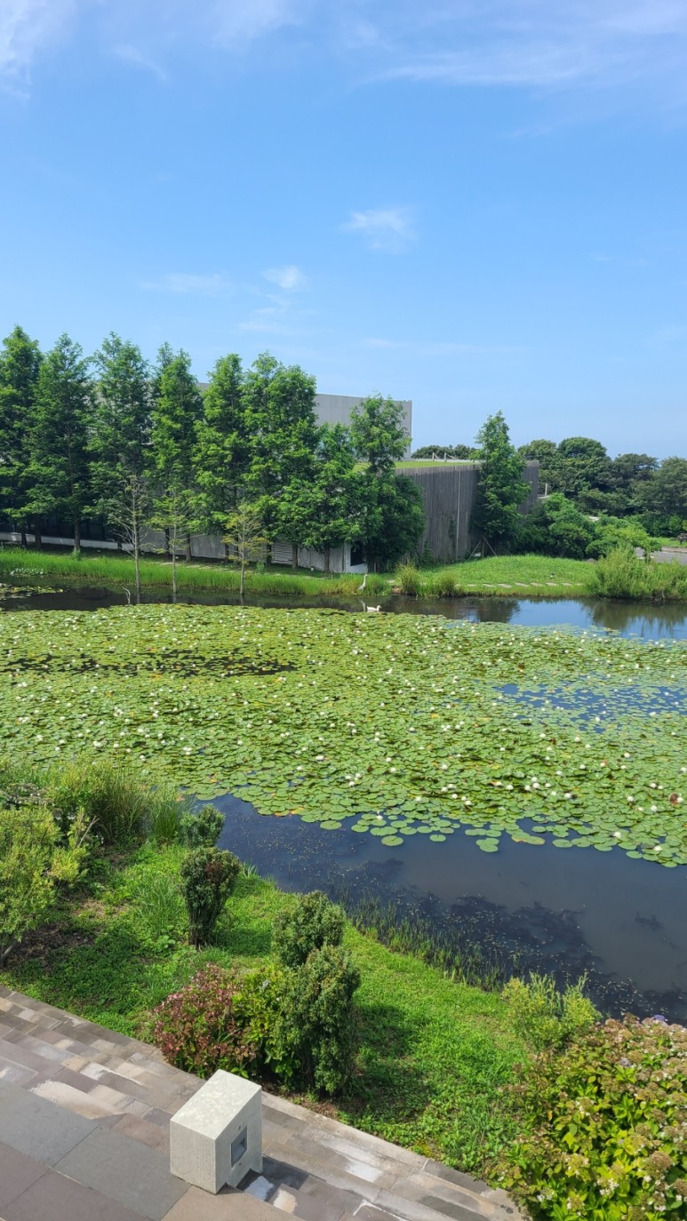 인공 수조를 조성해 건물이 물 위에 떠있는 듯한 느낌과 파란 하늘과
