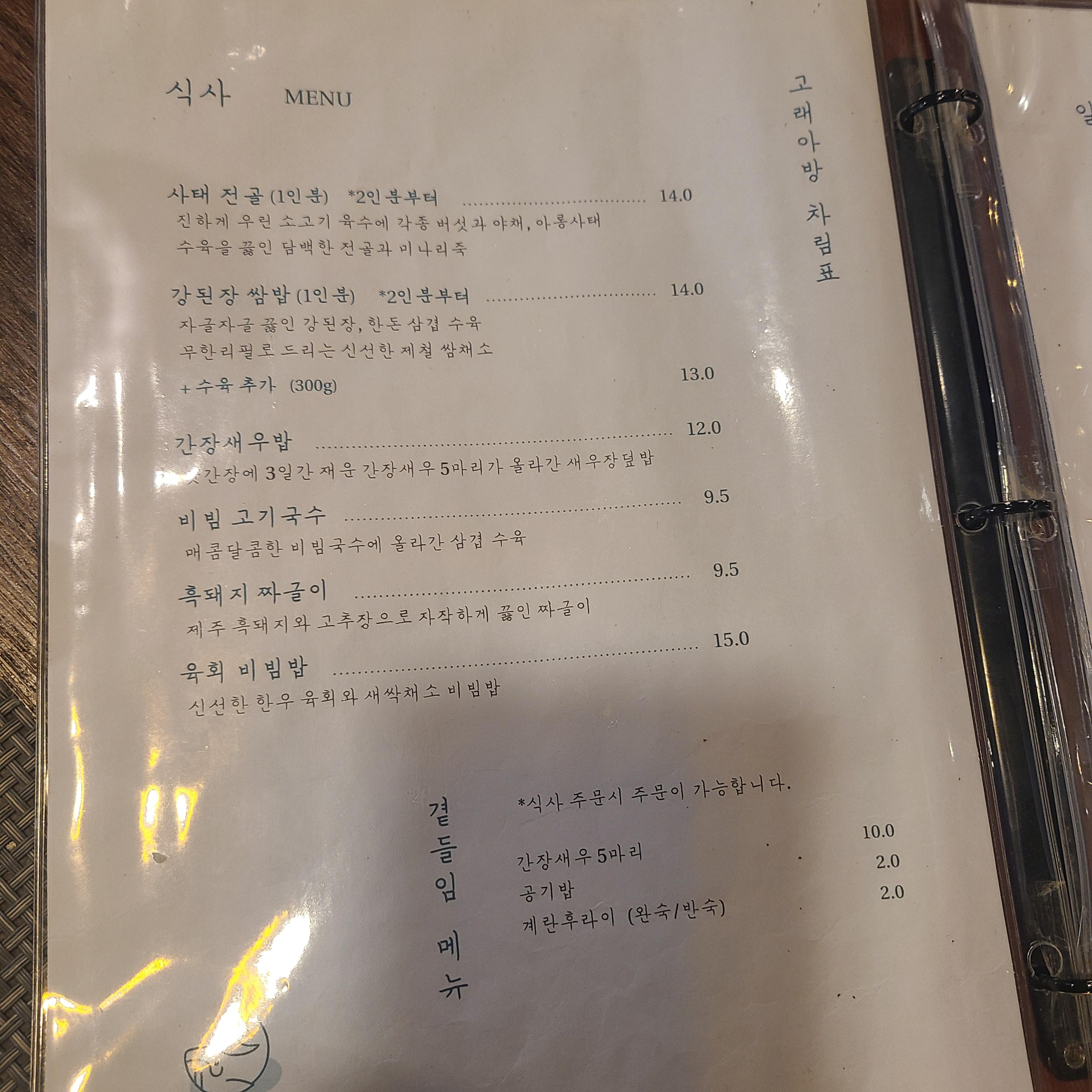 식사메뉴로는 사태전골, 강된장쌈밥, 간장새우밥