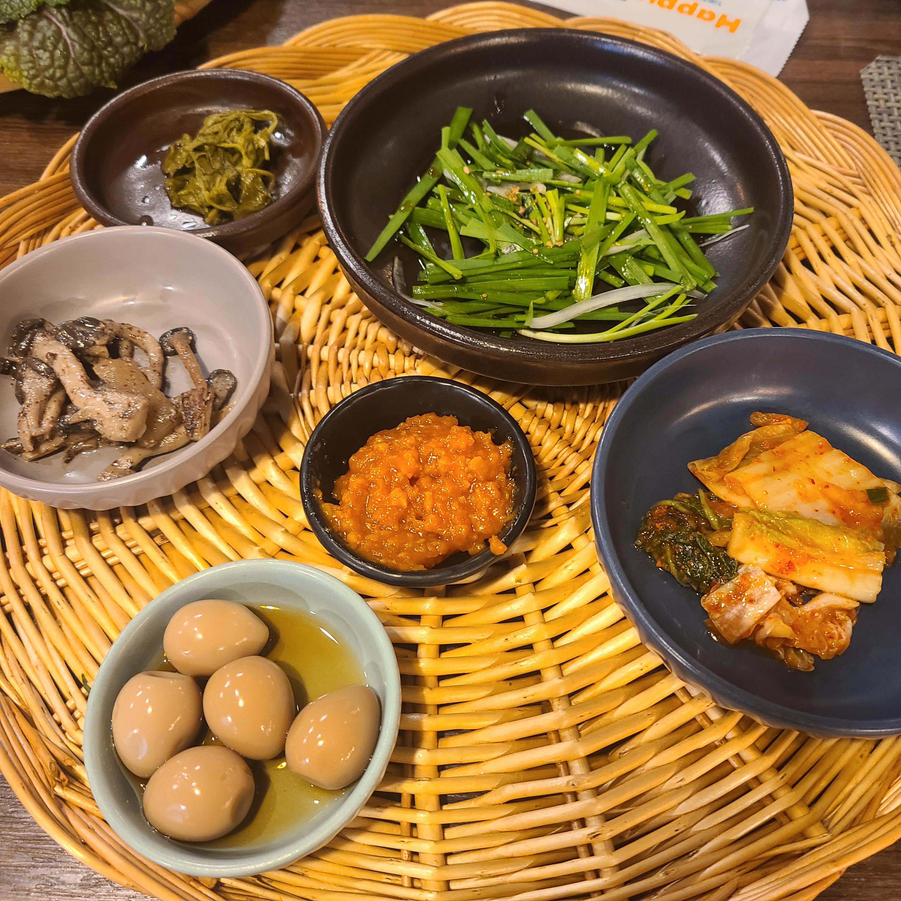 기본반찬으로 버섯, 김치, 부추, 메추리알을