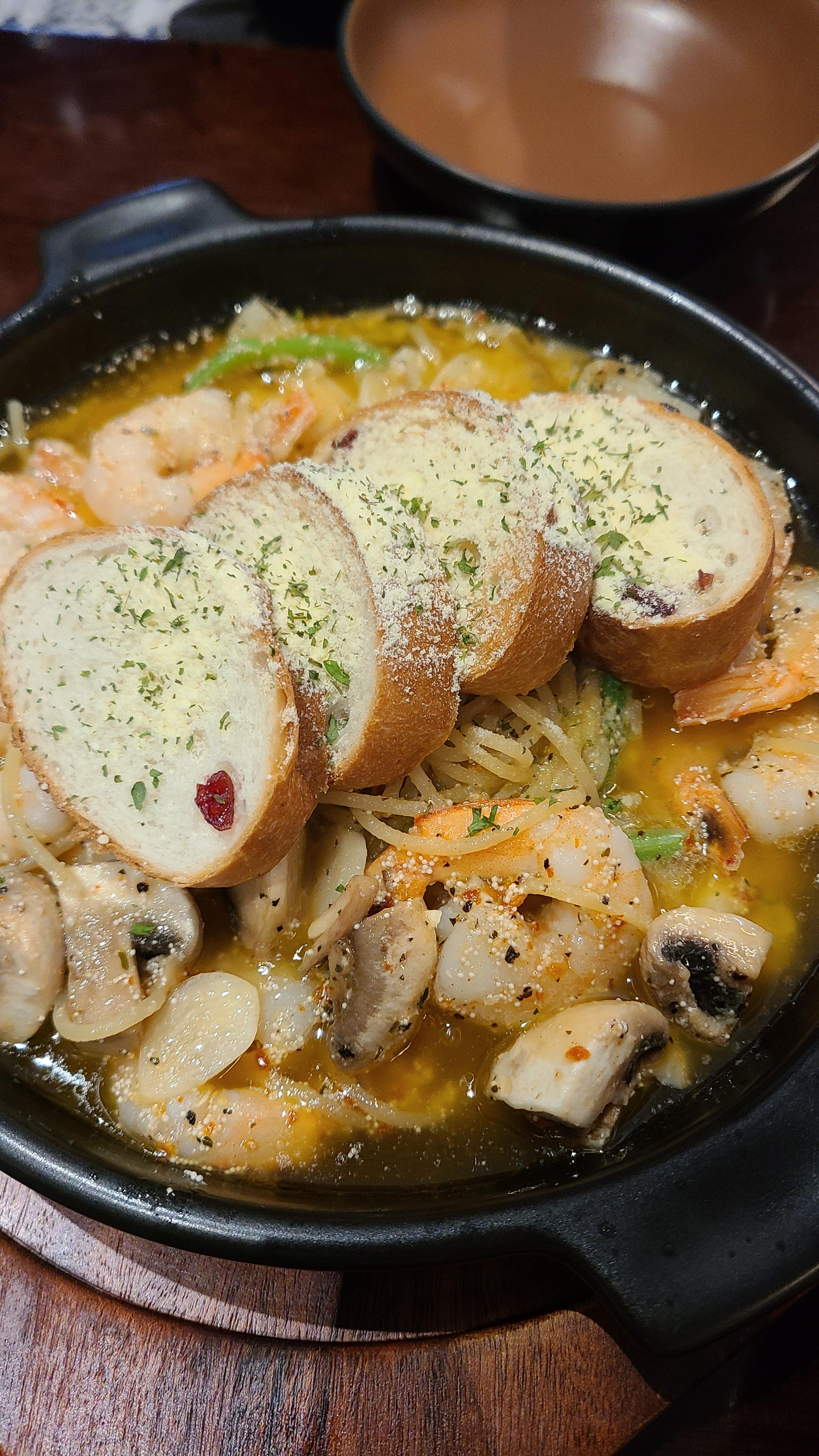 사모님 추천 메뉴 중에 감바스 파스타 시켰어요.