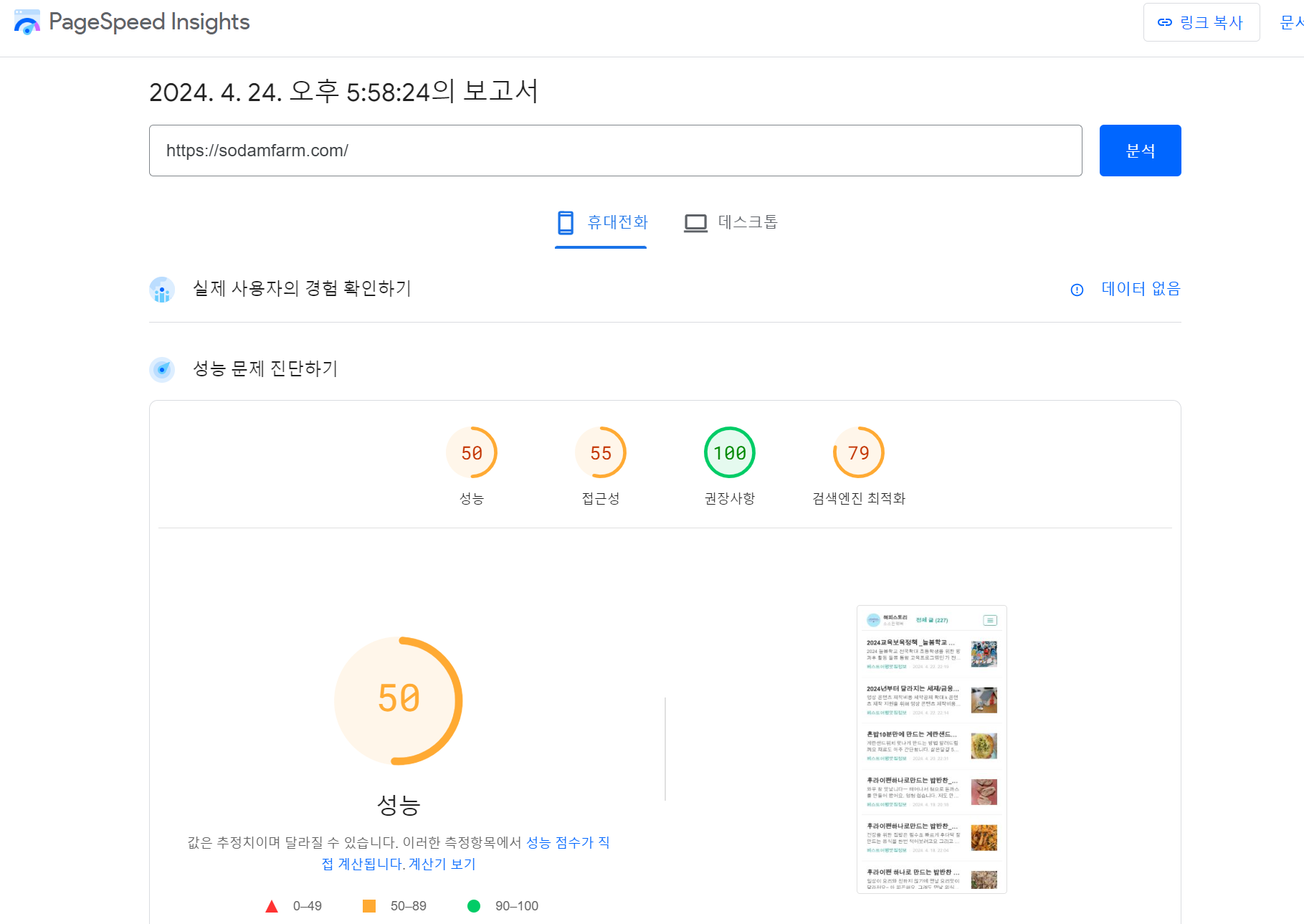 나의 사이트 주소를 넣고 성능을 진단해 보세요